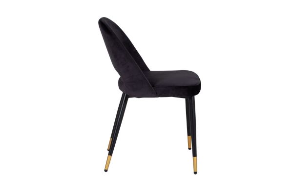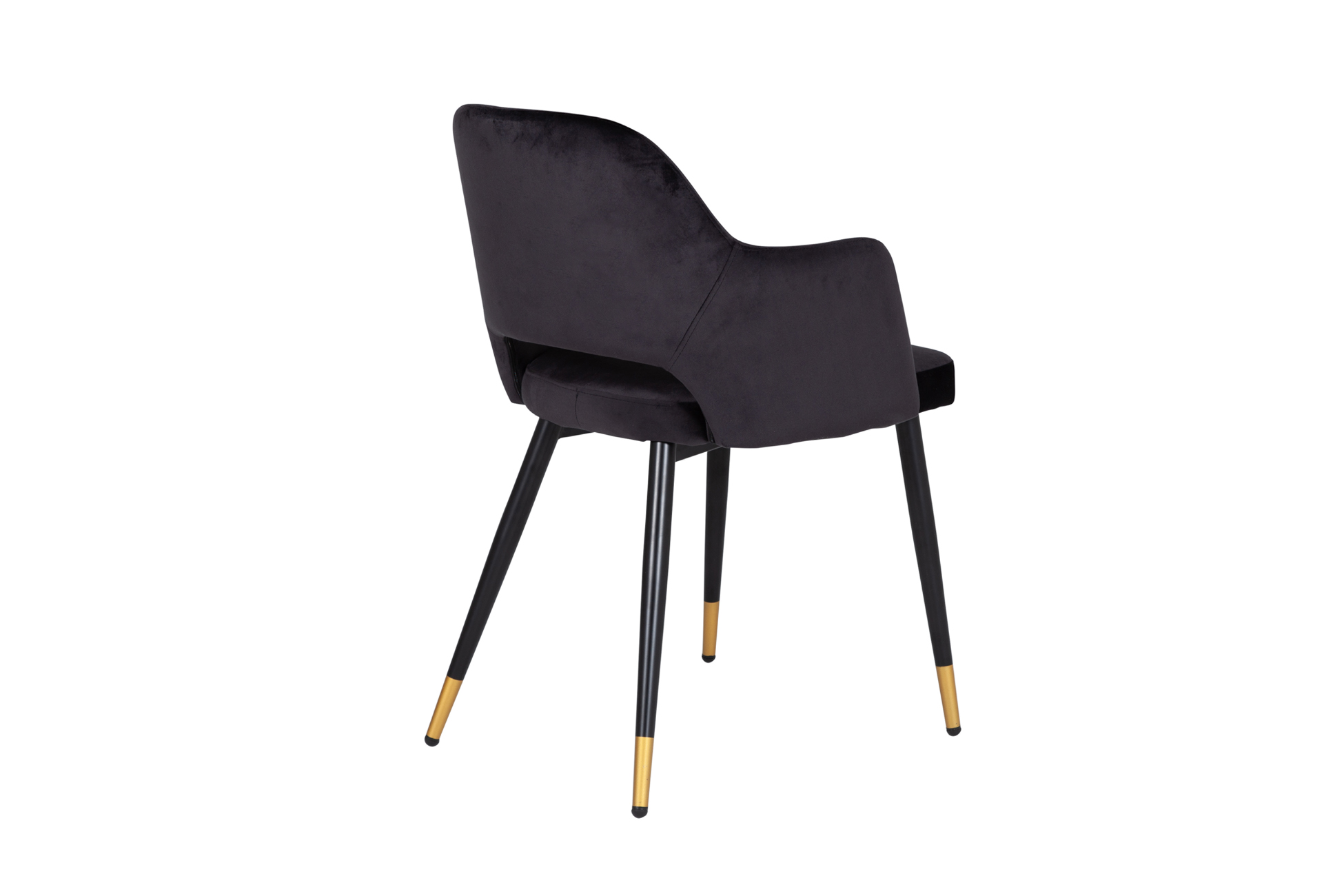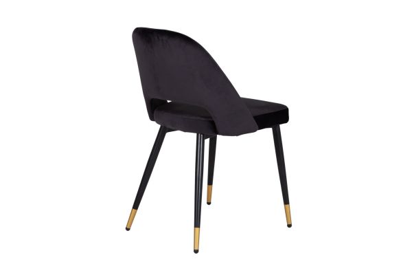 Velvet dining chair with gold finish leg. Minimalist Nordic style, ergonomic design. Padded seat, metal frame, available in three colour options – black, rust or mustard.