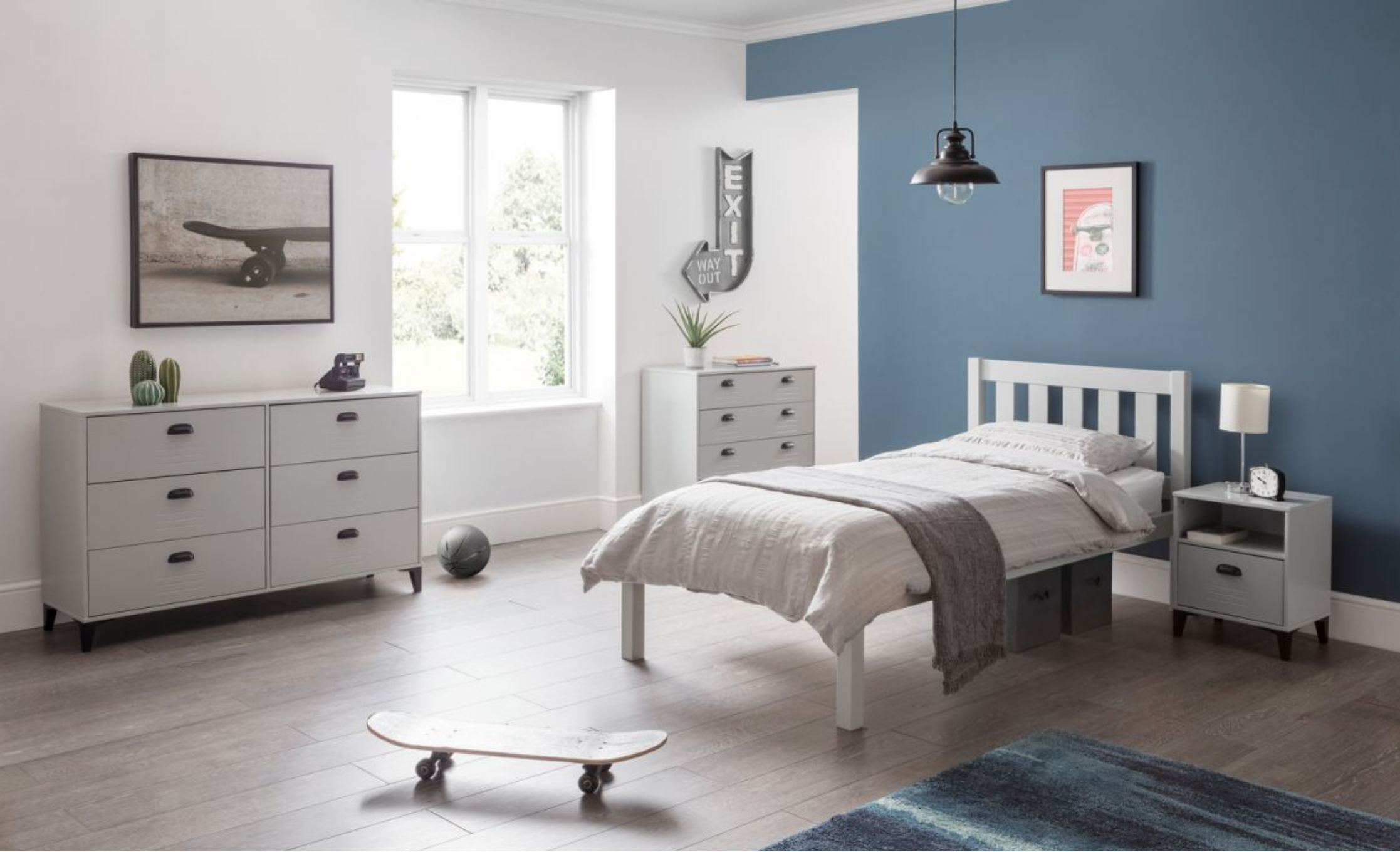 Crafted from solid pine and MDF in a metal effect grey lacquer with black metal effect legs and handles, the Makers chest of drawers features ventilation detailing to resemble a vintage locker effect. Perfect for a range of modern, retro bedrooms.