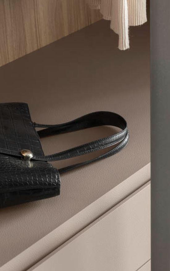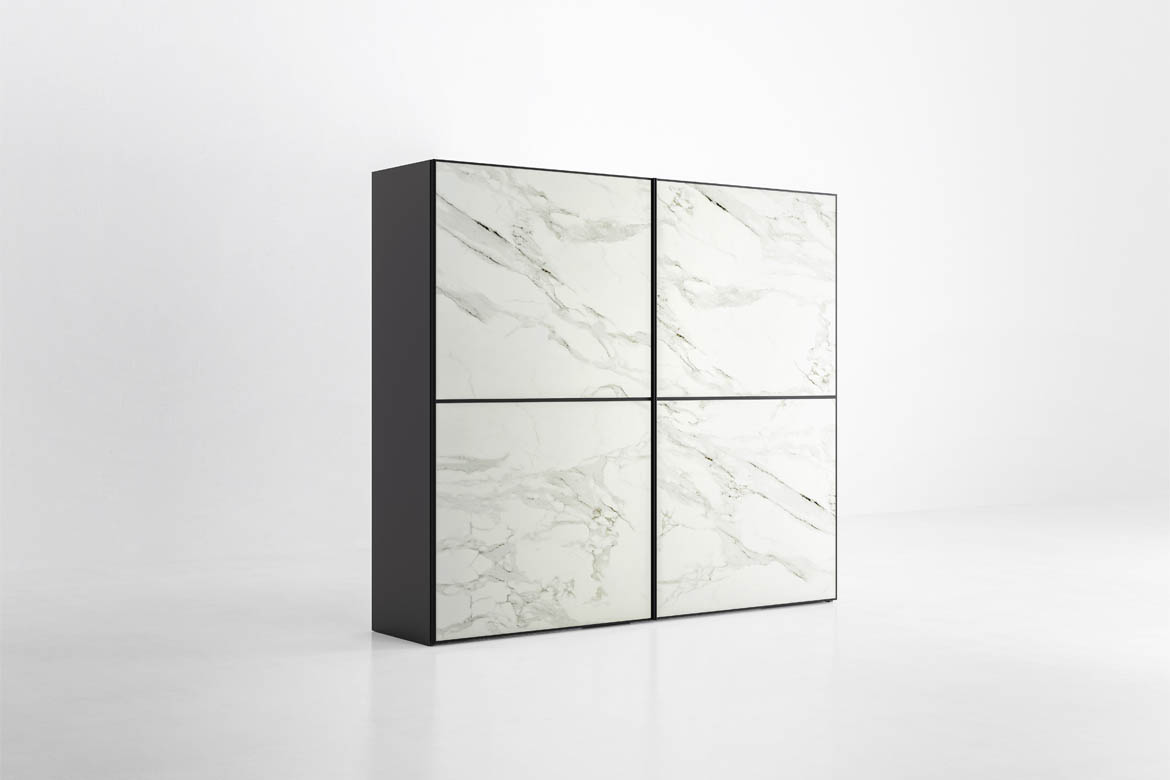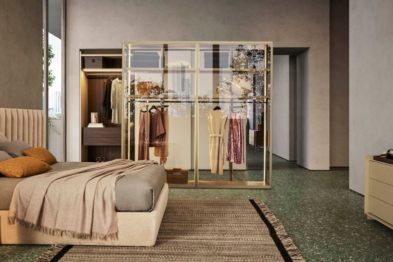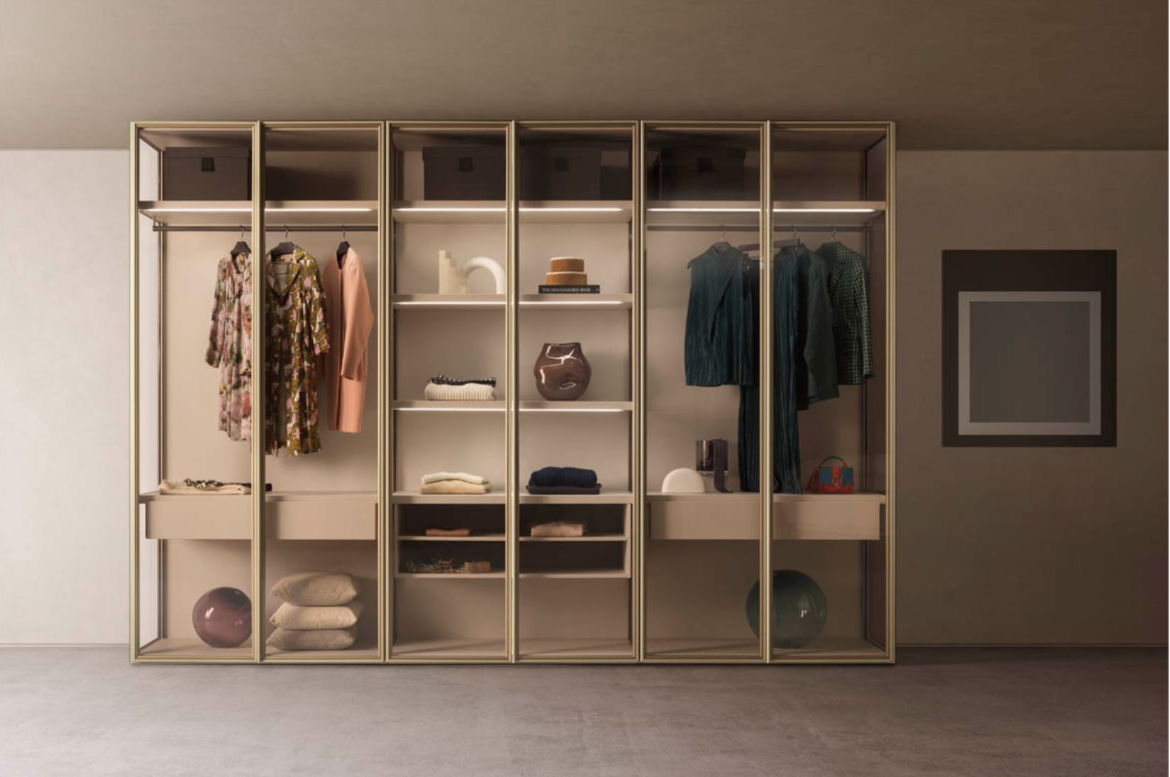 The surfaces of this design flow effortlessly, mirroring the simplicity and beauty of their material. The frame, expertly crafted to evoke the elegance of a masterpiece, presents a subtle yet sophisticated bevelled edge. Glass doors, available in a palette of finishes, slide open to reveal the contents with a refined and fresh aesthetic. In the sliding and flush sliding versions, the doors feature a horizontal profile that harmonizes with the frame, available in two exclusive finishes: Palladio and Canna di Fucile. This refined detail serves to accentuate the surfaces and structure, resulting in a design that is both beautiful and functional.