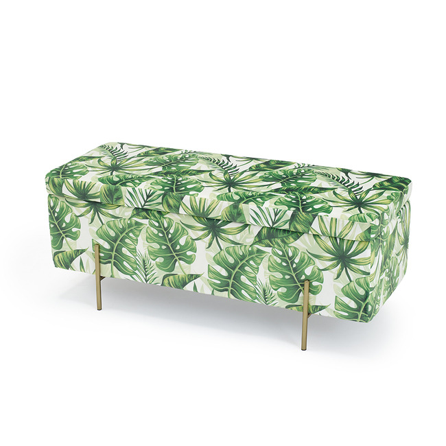 Bring the palm beaches of Los Angeles to you with this tropical palm print. The comfy, stylish and prominent print against the detailed, metallic legs will give your home an elegant and contemporary feel whilst practically creating storage space as the lid lifts off to open a spacious compartment for all your needs.